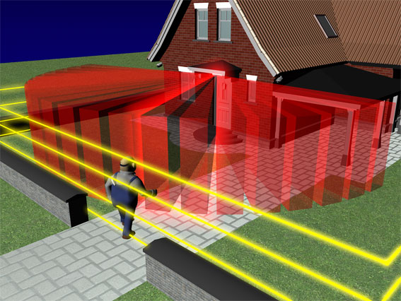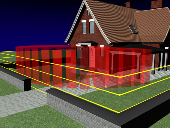 Entlang Ihrer Grundstücks-Grenze verlaufen die Infrarot-Strecken, die somit einen „virtuellen“ Zaun um Ihr Objekt bilden.